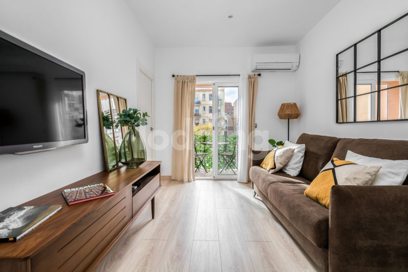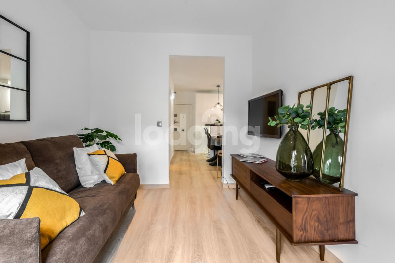 A living room with a comfortable sofa, a flatscreen TV and a balcony where you can take a seat, have a coffee and drink in the parks and streets of your new neighbourhood.