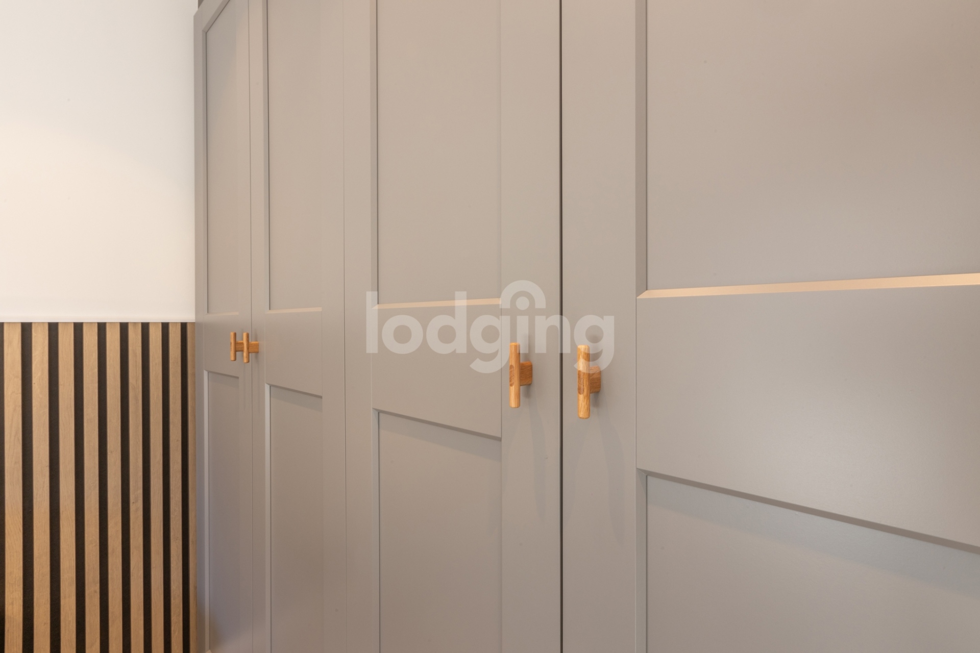 L’appartement dispose d’une spacieuse chambre double avec un grand placard, conçue pour le confort et le rangement, ainsi que d’une salle de bain moderne avec douche.