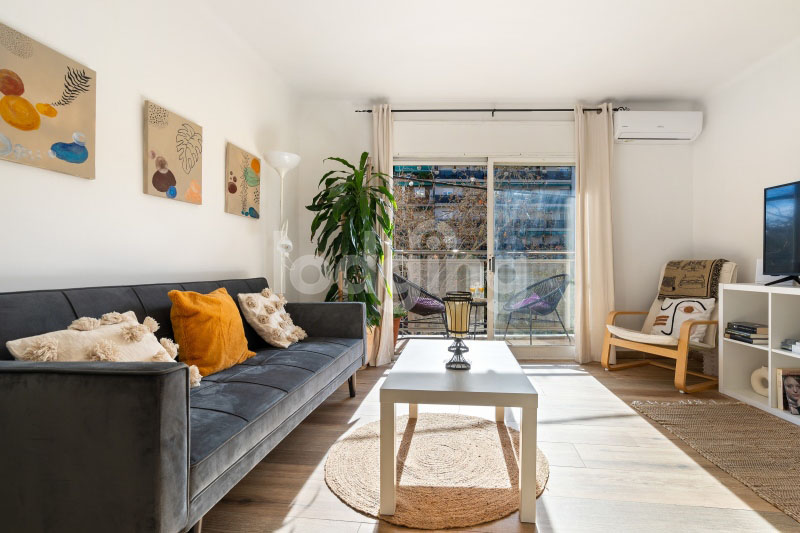 Et enfin, le salon, baigné par la lumière du soleil qui pénètre par le balcon. Dans le salon, vous disposez d'un canapé confortable, d'une télévision à écran plasma et de la climatisation pour rafraîchir l'appartement ensoleillé pendant les soirées d'été.