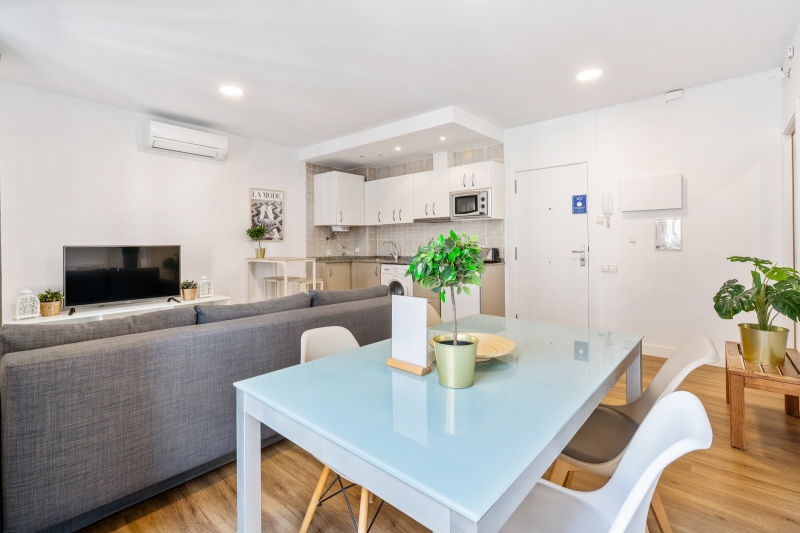 Lorsque vous ouvrez la porte de votre nouvelle maison à Barcelone, vous trouverez un salon lumineux avec une salle à manger et une cuisine avec de hauts plafonds et de grandes fenêtres qui s'ouvrent sur la célèbre rue de Sant Pau.
